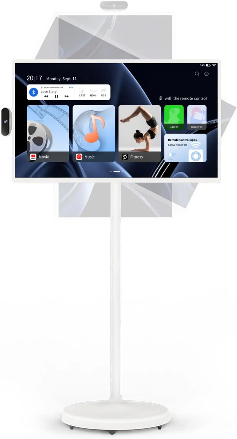 32-Inch Portable TV, 1080P FHD Rolling TV on Wheels with Rotatable Touch Screen, Android 13 OS, 8G RAM+128G Storage, Built-in Battery, Full Swivel Rotation, Voice Remote